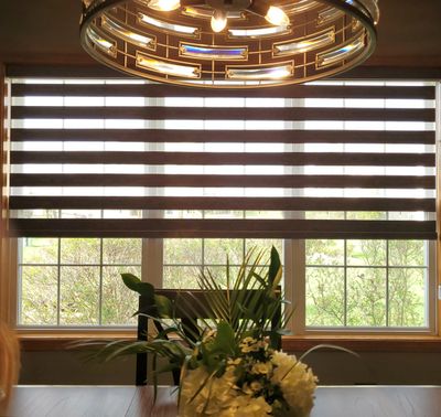 Designer Banded Shades feature a combination of sheer and solid fabric bands in a single shade. Alternating sheer fabric with solid fabric allows one piece of fabric to transition from open to closed providing a modern solution for view-through, light control and privacy. Fabrics are available in a variety of textures, colors, band heights, opacities and geometric designs.